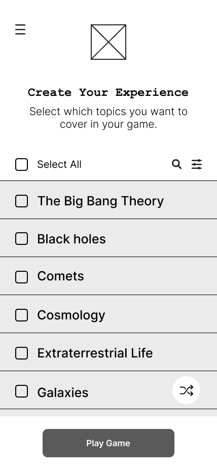 Having a two-step process allows users to select what type of game they want to play and which topics to focus on. Also, it may make it obvious that it’s a game (rather than a serious study tool).