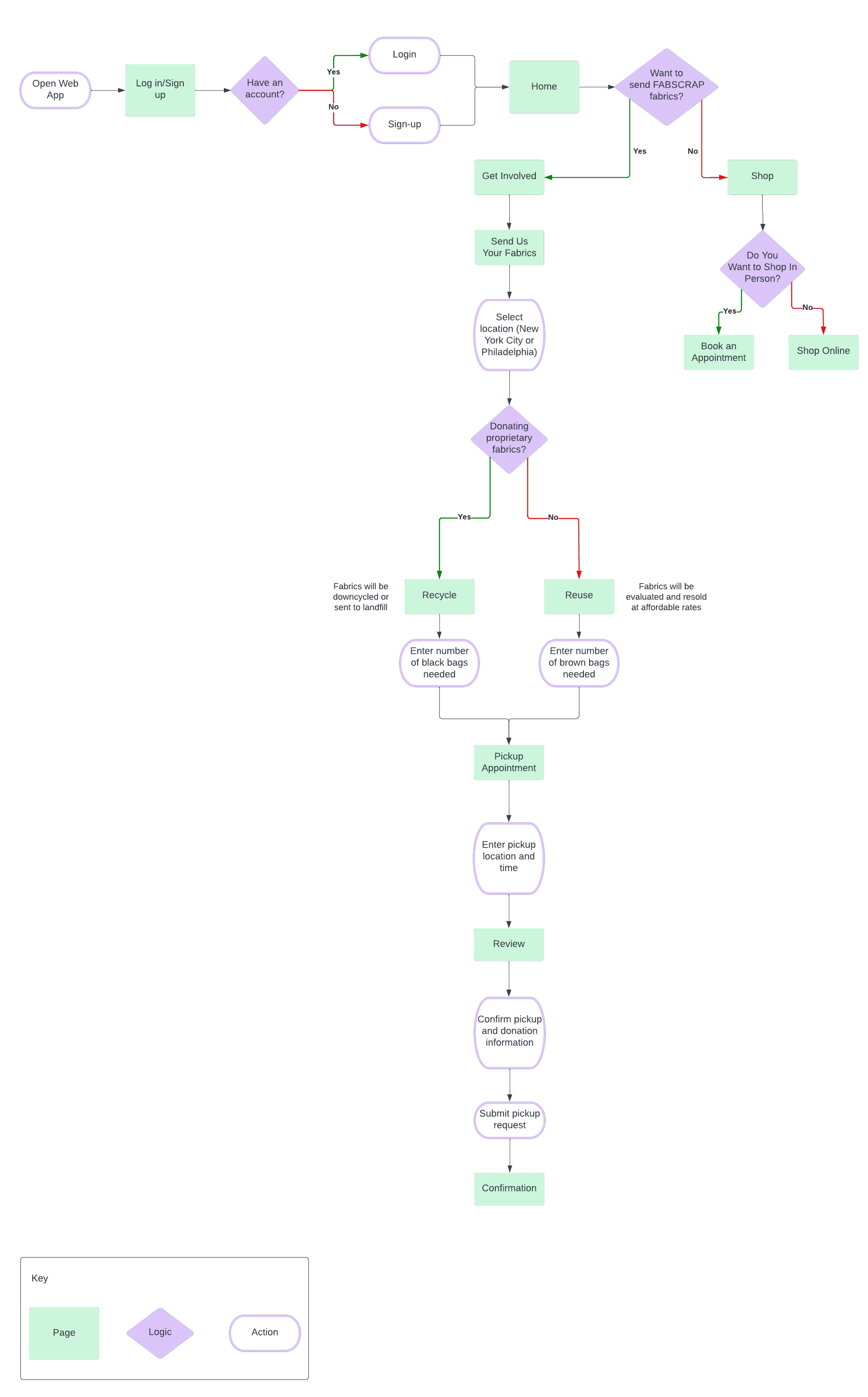 I created a user flow that shows how a user would achieve their main goal of sending fabrics to FABSCRAP for recycling/reusing. It also demonstrates how a user could shop for secondhand fabrics.